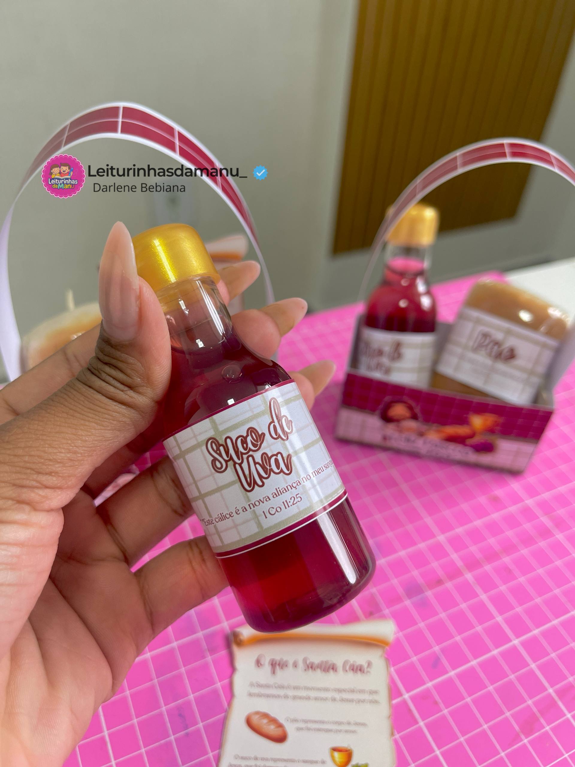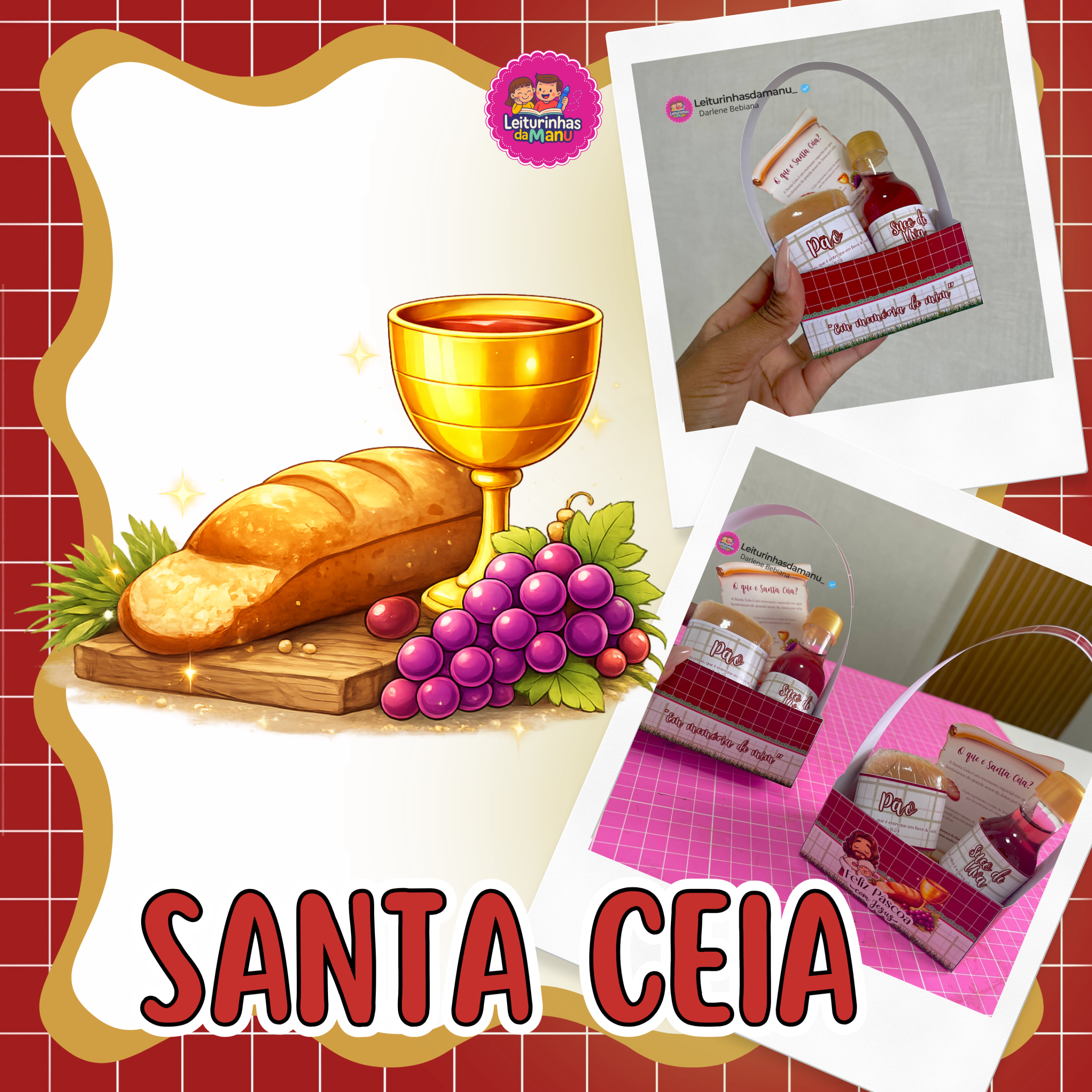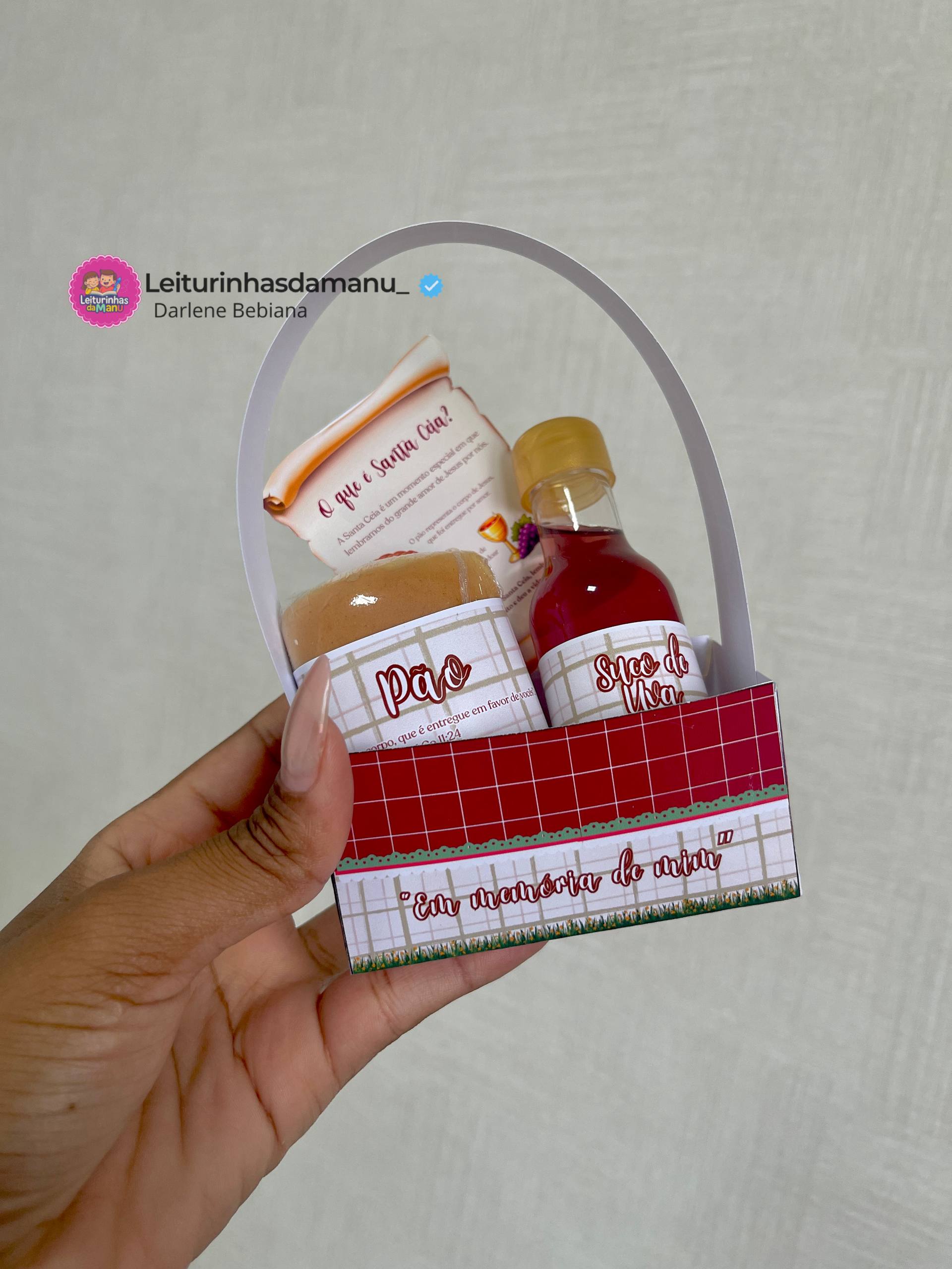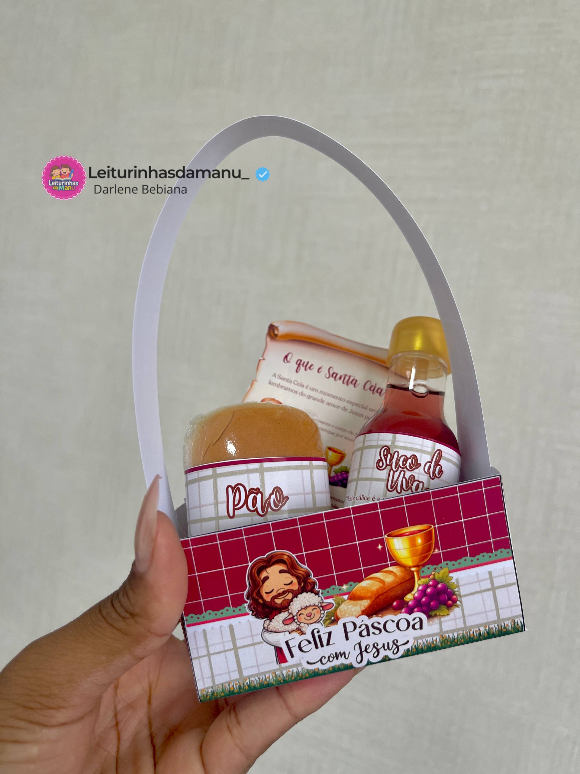 A cestinha acompanha elementos simbólicos que representam a Santa Ceia, ajudando as crianças a compreenderem o significado do pão e do suco da uva, lembrando do amor e do sacrifício de Jesus por nós.